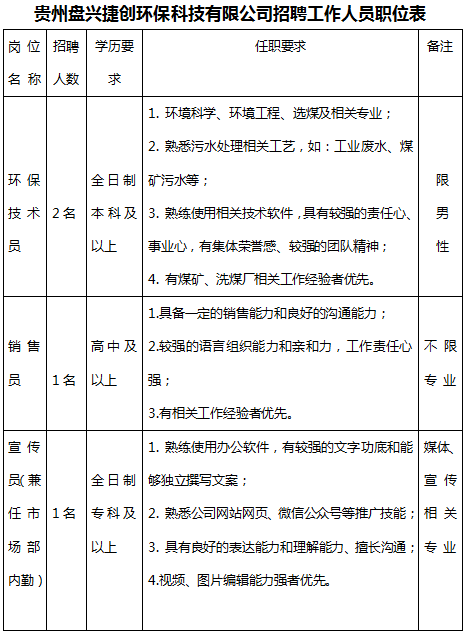 注:上述招聘公告最終解釋權歸貴州盤興捷創(chuàng)環(huán)保科技有限公司。
