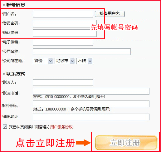 2.進(jìn)入帳號注冊頁面,按要求填寫帳號、密碼,郵箱,公司名稱,聯(lián)系電話,聯(lián)系人,聯(lián)系地址,填寫完成然后點(diǎn)擊“立即注冊”(如下圖)。(注:郵箱和電話必須填寫真實(shí),作為找回密碼與發(fā)送求職者簡歷的重要信息)