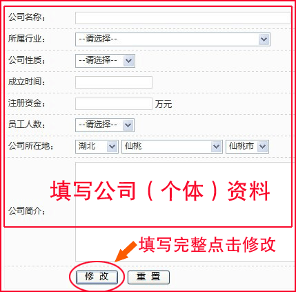 3.點(diǎn)擊立即注冊后,會彈出一個(gè)頁面,按照提示填寫公司簡介及詳細(xì)資料!填寫完成后點(diǎn)擊修改即可跳轉(zhuǎn)到發(fā)布招聘信息的頁面(如下圖)!