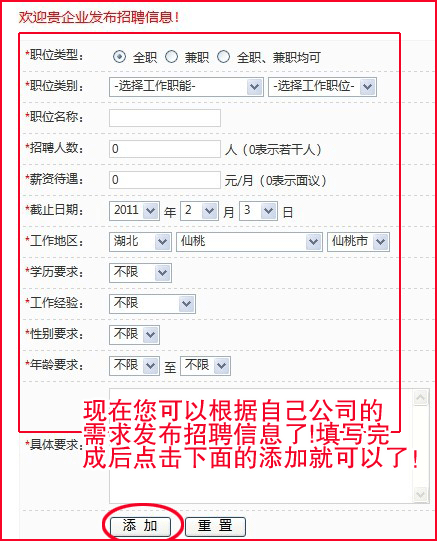 4.進(jìn)入發(fā)布招聘信息頁面,您可以根據(jù)自己的需求發(fā)布相關(guān)行業(yè)的招聘信息(如下圖)!