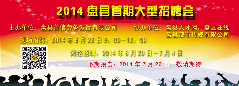 2014盤縣首屆大型招聘會由盤縣首信勞務(wù)派遣有限公司主辦,盤縣在線,盤縣人才網(wǎng)共同協(xié)辦,目的是為招聘單位和求職者搭建平臺,為雙方牽線、助經(jīng)濟發(fā)展、促社會和諧。